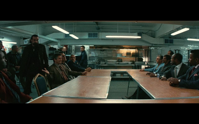 Throughout the rest of the scene the story point-of-view is a bit more neutral but notice how the camera favors Chechen’s position. From here on the scene is basically a dialogue between Joker and Chechen (personifying the group) on one hand, and Gambol who refuses to cooperate with Joker on the other. Note how the joker mostly talks facing screen-right, only looking left when he has to address Gambol. (In western countries movement from left to right feels like advancement, it creates a feeling of propulsion, whereas opposite movement feels like the opposite -this comes from our way of reading) When people stand up the camera looks up at them, matching the point-of-view of Chechen, who stays seated until the end.